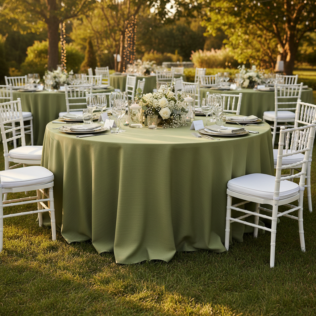 Il tovagliato color verde rosmarino è disponibile come accessorio per un’apparecchiatura elegante.
